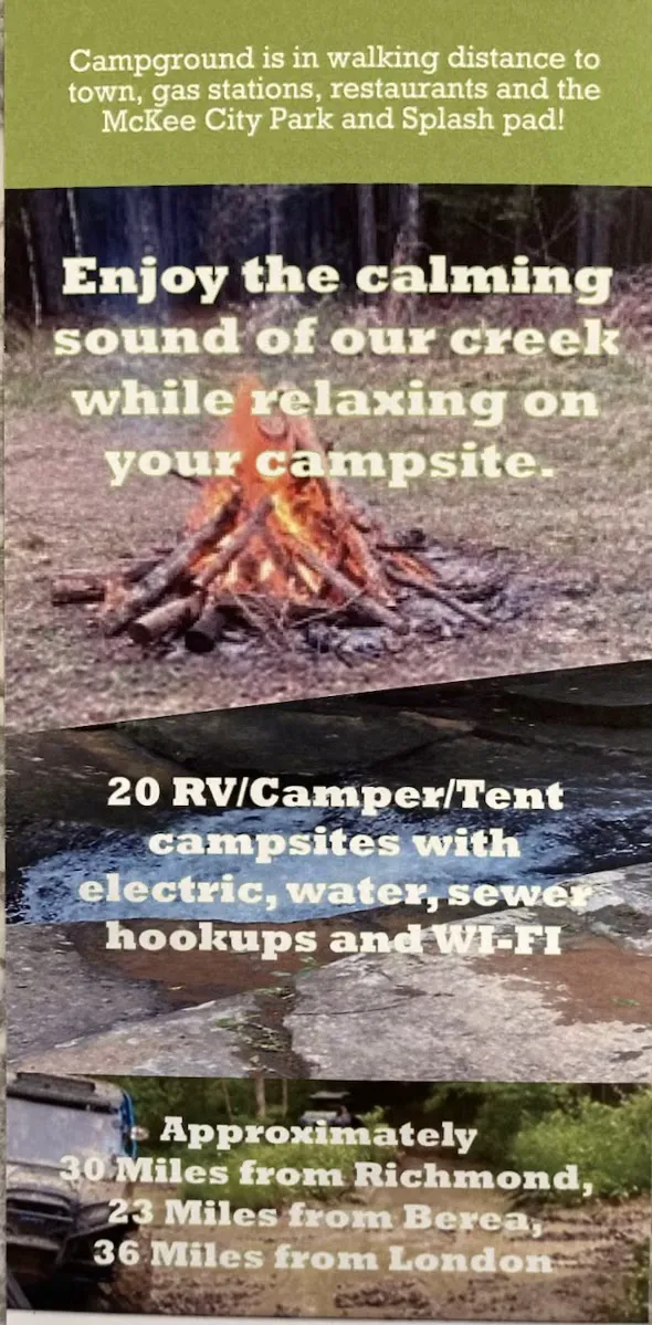 $10 for primitive tent camping. Nice spot near McKee downtown - quick walk to the gas station. No restroom but it’s in the process of being built. Each site has its own picnic table. RV/Campers have electric and water. There’s a children’s playground 100ft away. Very friendly owner!